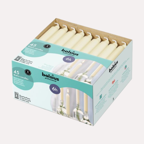 Haushaltskerzen in edlem Champagner. 45 Stück, ca. 6 Stunden Brenndauer, rußarm & tropffrei. Perfekt für Gastronomie, Events und Tischdekoration.